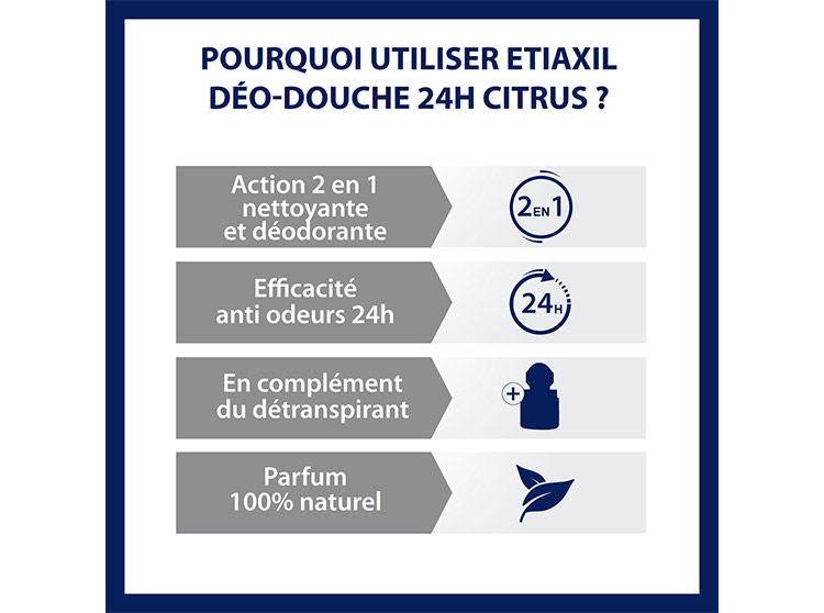Ce gel douche nettoie la peau grâce à des agents doux, son action déodorante neutralise et empêche la formation des mauvaises odeurs à l’aide du sel de Zinc (Zincidone®). Son complexe probiotique contribue à l’équilibre de la flore cutanée, tout en hydratant la peau grâce aux propriétés de l’aloe vera. Son parfum 100% d'origine naturelle à base d'huiles essentielles de citron jaune et de litsée procure une sensation de fraîcheur toute la journée. Etiaxil Déo-Douche Citrus 24h a été testé sous contrôle dermatologique, et est formulé au pH physiologique pour respecter la peau.