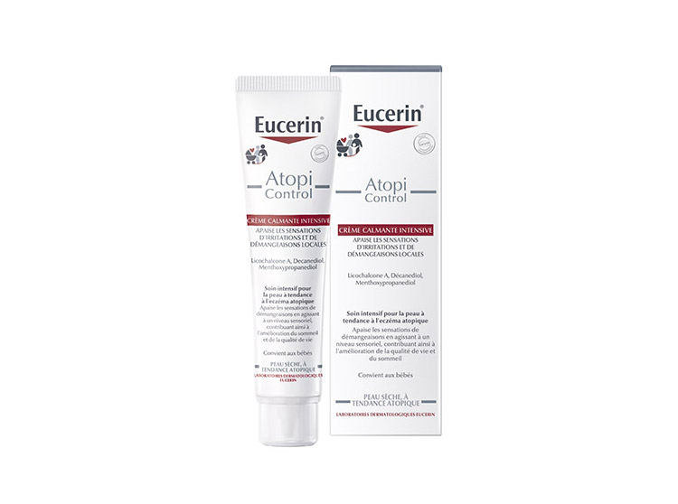 Eucerin AtopiControl Crème Calmante Intensive a été spécialement formulée pour soulager intensivement les peaux à tendance à l’eczéma atopique. La formule contient un complexe unique d'ingrédients actifs : la Licochalcone A apaisante, le Decandiol anti-bactérien et le Menthoxypropandiol (MPD) anti-irritant et rafraîchissant. Ce complexe, associé à une concentration élevée en céramides, renforce la barrière cutanée, atténue la sécheresse et soulage les sensations de démangeaisons, réduisant ainsi le besoin de se gratter.