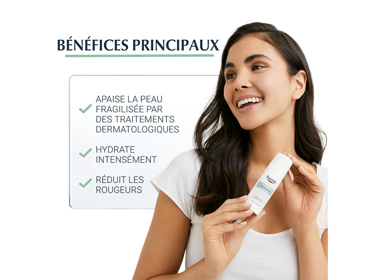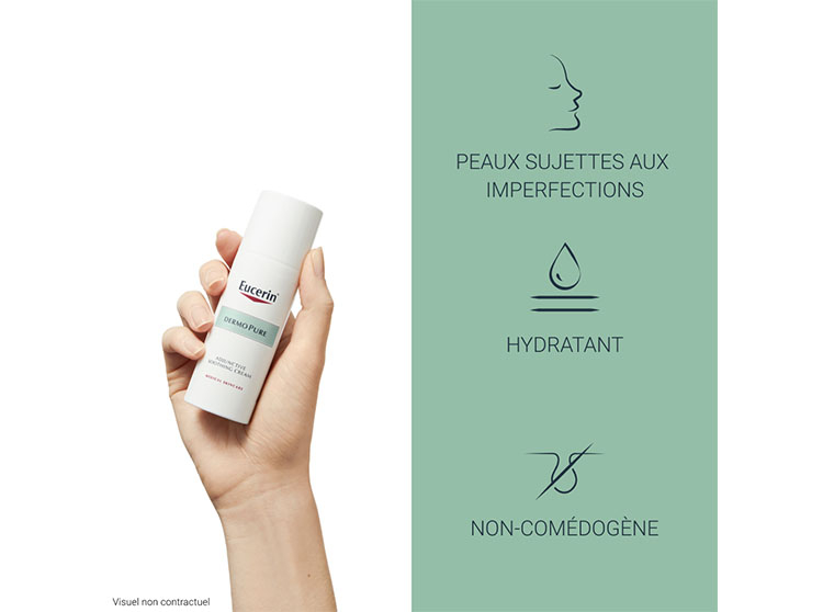 Eucerin DermoPure HYDRA Crème Compensatrice Apaisante Atténue les effets secondaires des traitements dermatologiques desséchants. Sa formule hydratante et non-collante apaise les irritations et réduit les sensations de tiraillements, ainsi que les rougeurs. Ce soin aide ainsi à reprendre le contrôle face aux besoins des peaux à imperfections.