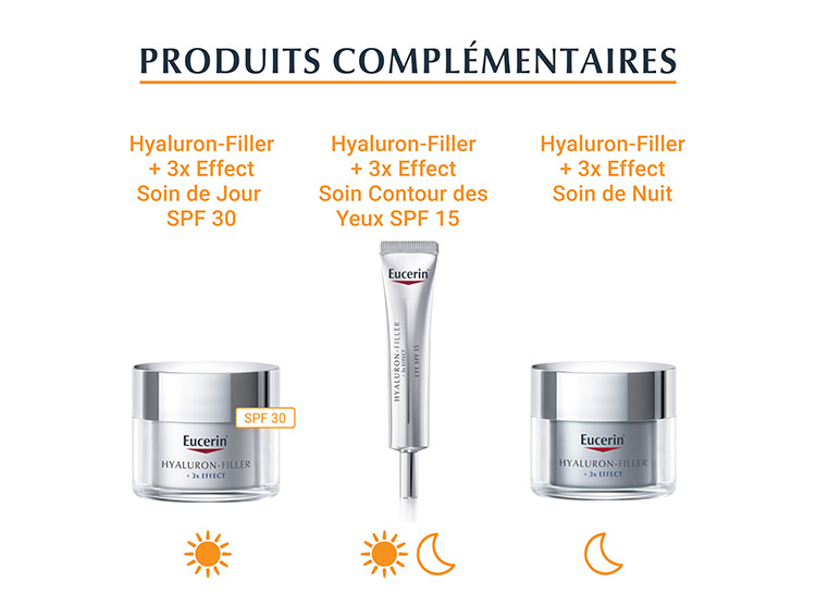 Poursuivez avec un soin hydratant approprié. Nous vous recommandons Eucerin HYALURON-FILLER + 3x EFFECT Soin de jour SPF 15 ou SPF 30, Eucerin HYALURON-FILLER + 3x EFFECT Soin de nuit et Eucerin HYALURON-FILLER + 3x EFFECT Soin contour des yeux SPF 15. Veillez à appliquer un soin hydratant avec une protection solaire pendant l’utilisation d’Eucerin HYALURON-FILLER + 3x EFFECT SÉRUM VITAMINE C BOOSTER et une semaine après la dernière utilisation.