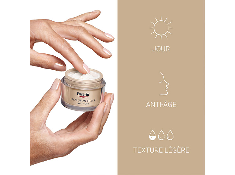 Eucerin Hyaluron-Filler + Elasticity Soin de Jour SPF 15, soin de jour anti-âge, crème anti-rides, crème anti-taches, soin pour réduire les signes de l'âge Eucurin Hyaluron Filler, Soin Eucerin à l'acide hyaluronique pour combler les rides, crème de jour SPF15 pour améliorer l'élasticité de la peau, crème pour peaux matures contre les taches brunes, soin Eucerin Hyaluron Filler Elasticity acide hyaluronique et collagène de la peau.
