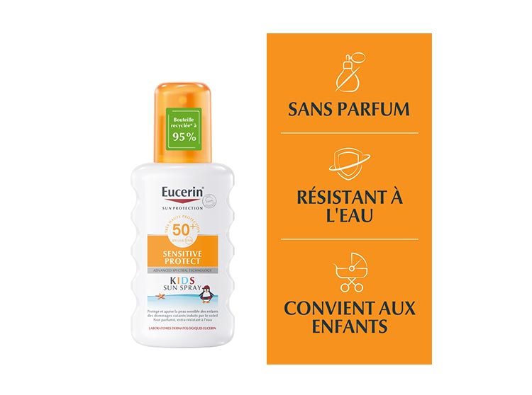 Eucerin Sun Protection Sensitive Protect Kids Spray SPF 50+ est spécialement conçu pour protéger la peau sensible des enfants contre les coups de soleil et offre une protection cellulaire biologique pour réduire les risques de dommages à long terme dus aux UV. Il est sans parabènes, sans colorant et sans parfum. Il est également très résistant à l'eau.