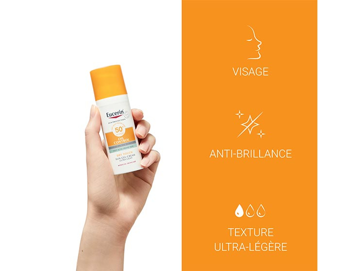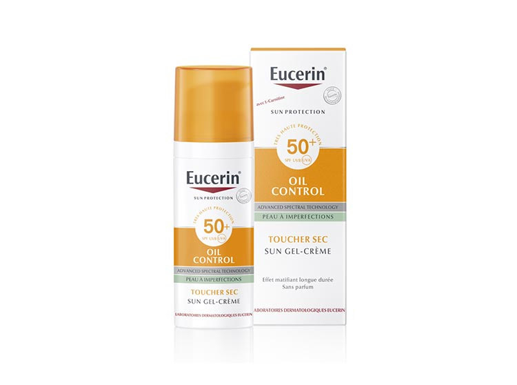 Eucerin Sun Protection Oil Control Gel-Crème SPF 50+ est une crème solaire visage non comédogène, qui ne contient ni parfum ni paraben, et constitue une base de maquillage idéale.