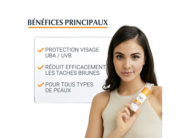 Bénéfices principaux de la crème solaire anti-taches visage Eucerin Sun Pigment Control Fluid SPF50+ :