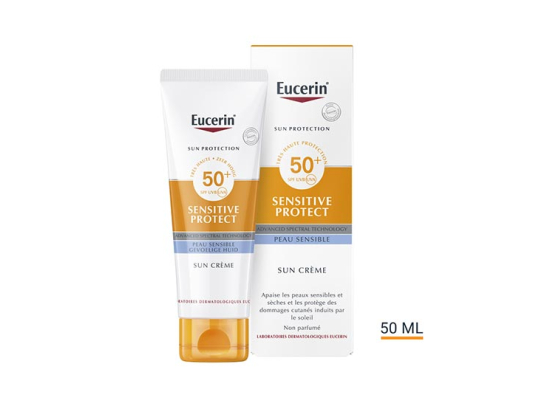 Eucerin SUN PROTECTION SENSITIVE PROTECT Crème SPF 50+ est un écran solaire pour le visage avancé et spécialement conçu pour protéger du vieillissement cutané et des taches d'hyperpigmentation causés par le soleil. Pour les peaux normales et sèches. Résistant à l'eau. Sa formule innovante offre une protection contre les dommages liés aux UV, tant dans les couches supérieures que dans les couches les plus profondes de la peau : Un système de filtres UVA/UVB hautement efficaces et stables avec Tinosorb S protège activement des coups de soleil. Conforme aux recommandations établies par l'UE Une stimulation du processus naturel de réparation des cellules cutanées endommagées par le soleil grâce à la présence de l'acide glycyrrhétinique. Une protection cellulaire à la licochalcone A, un anti-oxydant puissant qui protège les cellules de la peau contre les dommages causés par les radicaux libres.