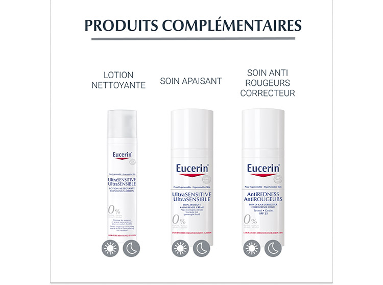 Si la peau montre des signes visibles de rougeurs ou si vous désirez une protection solaire SPF, utiliser Eucerin AntiRougeurs Soin Apaisant ou Eucerin Antiougeurs Soin de Jour Correcteur SPF 25.