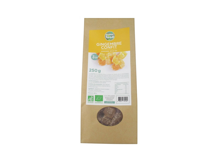 Le gingembre est un fruit originaire d'Asie. On utilise son rhizome dans la consommation courante. C'est une épice très employée dans un grand nombre de plats asiatiques et indiens. Ce gingembre confit bio, originaire du Sud de la Chine a été sélectionné pour sa saveur très parfumée, épicée et idéalement sucrée. Il est reconnu pour ses propriétés toniques et favorise la digestion en fin de repas.