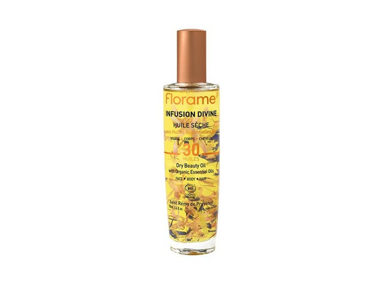 L'Infusion Divine Florame, à la texture sèche et soyeuse, met à l'honneur notre savoir-faire exclusif en aromathérapie biologique dans une composition inédite : 30 huiles* célèbrent nos 30 années d'expertise, au service de la beauté de la peau et des cheveux, toujours plus biologique, plus concentrée, plus efficace. Au coeur de cette essence botanique, les Huiles Végétales bio protectrices et nourrissantes se conjuguent à l'efficacité des Huiles Essentielles, précieuses alliées revitalisantes et tonifiantes.