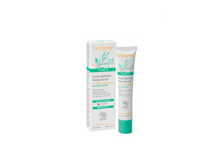 Le Fluide Matifiant Rééquilibrant Florame Certifié Bio, à la texture soyeuse et légère, concentre toute l’efficacité d’un complexe unique d’actifs d'origine naturelle pour une prise en charge à la fois globale et ciblée des peaux mixtes à grasses.