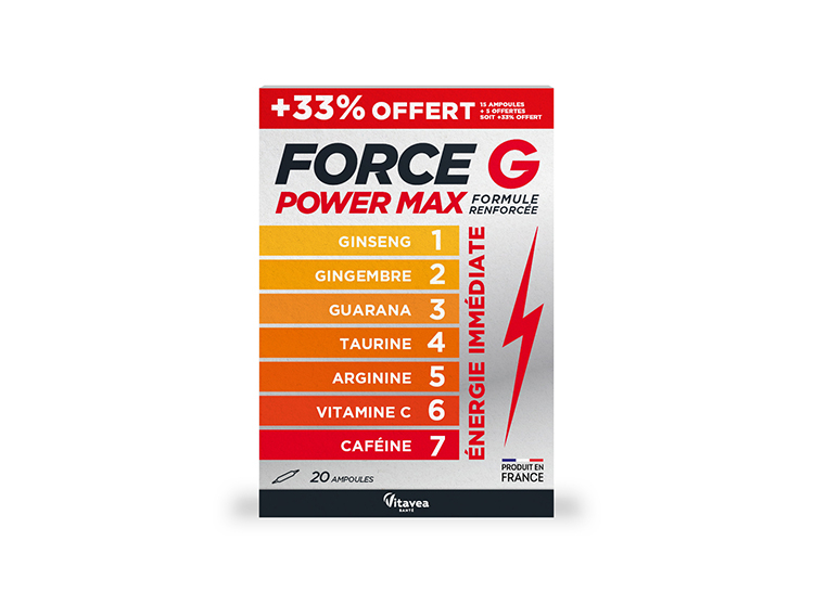 Énergie immédiate avec du Ginseng, Gingembre, Guarana, Taurine, Arginine, Vitamine C, Caféine.