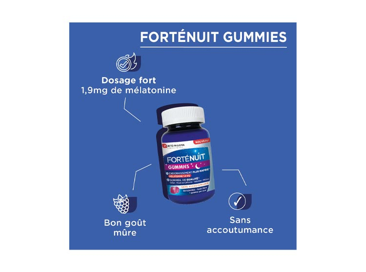 Le sommeil est indispensable pour le bon fonctionnement de notre organisme. Pour éviter de mauvaises nuits, Forté Nuit Gummies vous aide à faciliter votre endormissementgrâce à la mélatonine et à améliorer la qualité de votre sommeil grâce au pavot de Californie présent dans la formule.