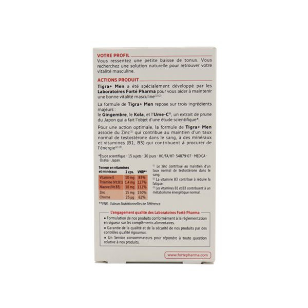 Tigra+ Men de Forté Pharma est un programme de 14 jours qui stimule le désir et la vitalité masculine. Ses actifs d’origine naturelle sont le Gingembre, le kola et l’Ume-C, des vitamines et des minéraux qui maintiennent un taux de testostérone normal dans le sang et donnent de l’énergie. Ce complément alimentaire est sans gluten, sans gélatine et sans ingrédient d’origine animale.