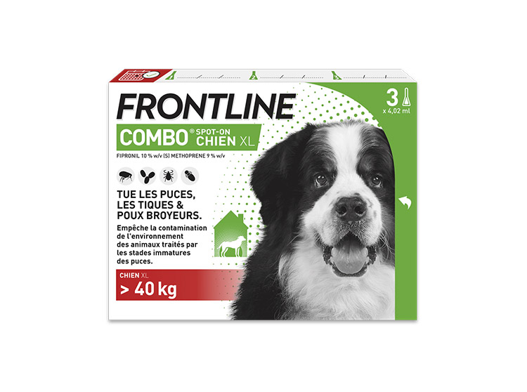 FRONTLINE COMBO spot-on est un médicament vétérinaire indiqué pour lutter contre les puces, les tiques et/ou les poux broyeurs chez les chiens. Demandez conseil à votre pharmacien ou votre vétérinaire. Lire attentivement la notice. En cas de persistance des symptômes, consultez un vétérinaire. Ne pas utiliser chez les lapins. Se laver les mains après administration. Éviter tout contact avec l’animal tant que le site d’application n’est pas sec.