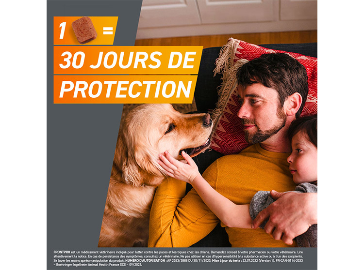 Plus besoin de multiplier les traitements anti-parasitaires. Avec 1 comprimé Frontpro, vous protégez votre chien pendant 1 mois et prévenez la contamination de votre habitat. Le traitement Frontpro agit de l'intérieur vers l'extérieur et ne perd pas en efficacité en cas de bain ou de sorties en extérieur.