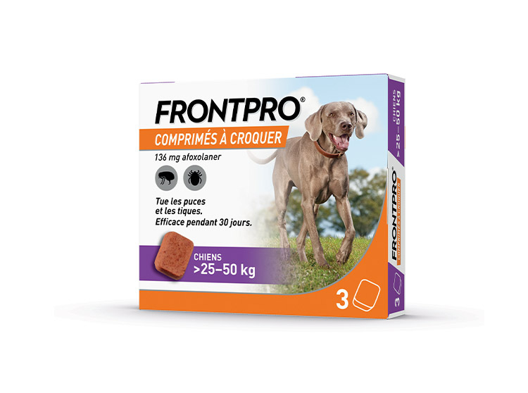 Dosé à 136 mg d'Afoxolaner, le comprimé Frontpro offre un effet rapide contre les puces et les tiques. Ce principe actif élimine rapidement les parasites présents sur votre chien et le protège de la contamination pendant 1 mois.