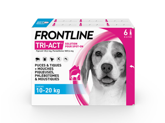 Frontline Tri-Act est un traitement anti-tiques et anti-puces pour chiens à l'effet radical contre 5 parasites (puces, tiques, moustiques, phlébotomes et mouches piqueuses). Il élimine aussi les puces avant qu'elles ne pondent.