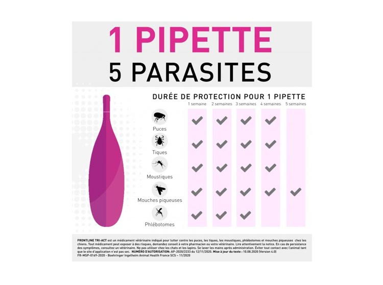 FRONTLINE TRI-ACT est un traitement anti-tiques et anti-puces pour chiens à l'effet radical contre 5 parasites (puces, tiques, moustiques, phlébotomes et mouches piqueuses). Il élimine aussi les puces avant qu'elles ne pondent.