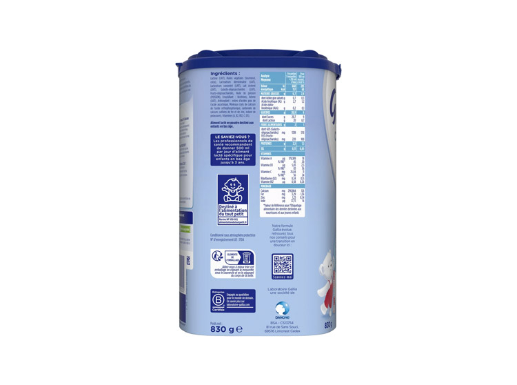Ingrédients : Lactose (LAIT), Huiles végétales (tournesol, colza), Lactosérum déminéralisé (LAIT), Lactosérum concentré (LAIT), Laitécrémé (LAIT), Galacto-oligosaccharides (LAIT), Fructo-oligosaccharides, Huile de POISSON (POISSON), Emulsifiant : lécithines, Arôme (LAIT), Antioxydant : esters d'acides gras de l'acide ascorbique, Minéraux (sels de calcium de l'acide orthophosphorique, carbonate de calcium, sulfates de fer et de zinc, iodure de potassium), Vitamines (A, B2, B12, C, D3).