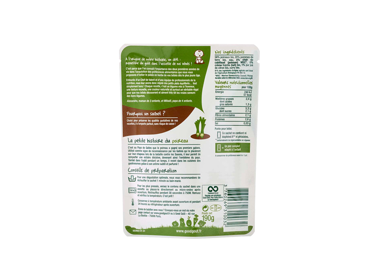 56% de poirreaux BIO, 20% de pommes de terre BIO, 10% d'eau de cuisson, 8% de cabillaud, de la crème fraîche BIO, un soupçon de curry BIO et c'est tout !