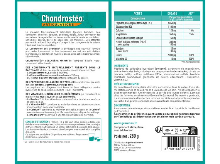 Les problèmes articulaires peuvent impacter la qualité de vie au quotidien, entraînant une sensibilité accrue, une perte de souplesse et de mobilité. Que ce soit dû à la pratique sportive, aux changements saisonniers, à l'âge ou à une mauvaise posture, maintenir des articulations saines est essentiel. C'est pourquoi le Laboratoire Granions a développé Chondrostéo+ Collagène Marin, une formule innovante pour soutenir le bon fonctionnement des articulations, cartilages, os, tendons et muscles.