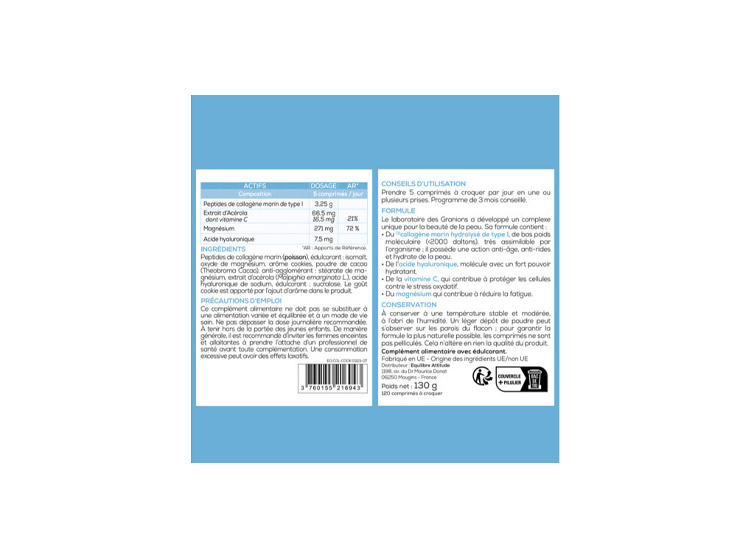 Peptides de collagène marin (poisson), édulcorant : isomalt, oxyde de magnésium, arôme cookies, poudre de cacao (Theobroma Cacao), anti-agglomérant : stéarate de magnésium, extrait d’acérola (Malpighia emarginata L.), acide hyaluronique de sodium, édulcorant : sucralose. Le goût cookie est apporté par l’ajout d’arôme dans le produit.