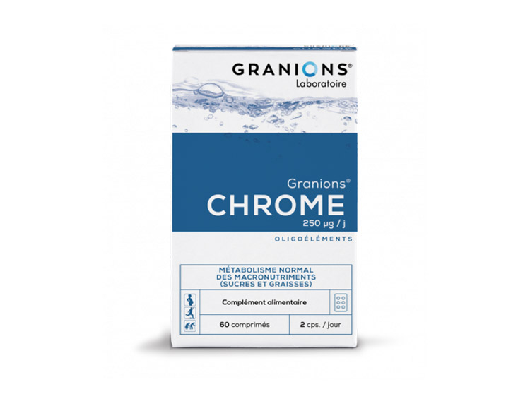 Des études scientifiques démontrent l’efficacité du Chrome dans le maintien de la glycémie. Spécialiste des oligoéléments, le Laboratoire des GRANIONS a mis au point Granions de chrome 250 µg/j (2 comprimés de 125 µg par jour), répondant ainsi aux nouvelles avancées scientifiques.