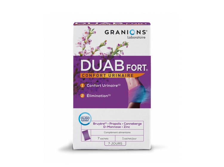 Ce complément alimentaire Duab Fort de Granions permet de traiter les gênes urinaires des femmes qui peuvent apparaitre et récidiver quel que soit l'âge. Composé de propolis, canneberge, bruyère et D-mannose, l'association de ces 5 ingrédients permettent d'apporter un bien-être et confort urinaire.