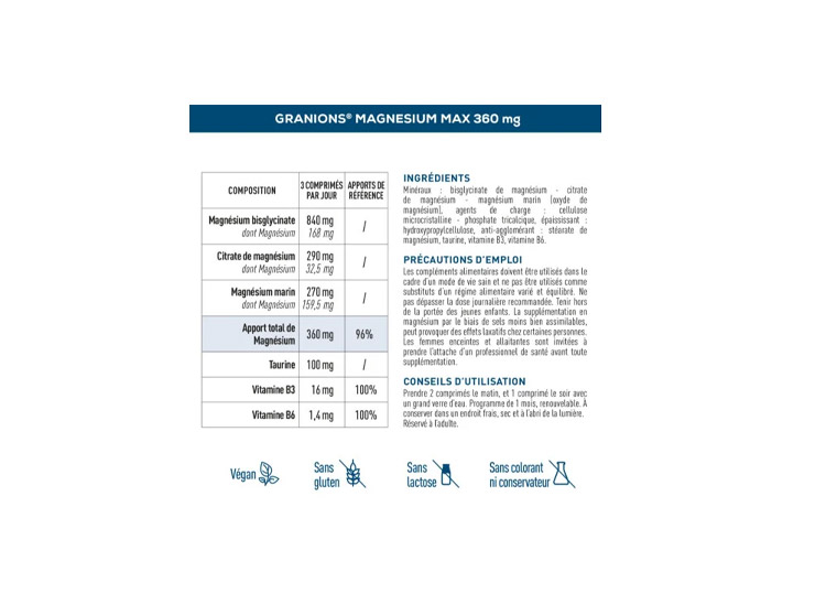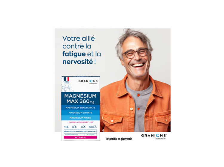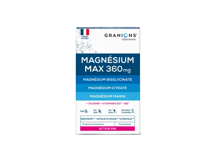 Le laboratoire des Granions® a développé une formule de magnésium extra forte, composée de trois sources de sels différentes : du magnésium bisglycinate, du citrate de magnésium et du magnésium marin pour une efficacité et une assimilation optimales.
