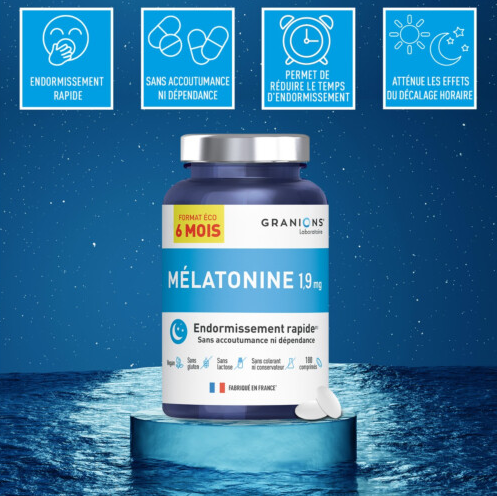 LES BIENFAITS DE LA MÉLATONINE : GRANIONS Mélatonine 1,9 mg est un complément alimentaire formulé à base de mélatonine, également appelée hormone du sommeil. Elle contribue à réduire le temps d'endormissement et à atténuer les effets du décalage horaire. Ce pilulier économique contient 180 comprimés dosés à 1,9 mg de mélatonine chacun. Il permet de réaliser 180 nuits de sommeil. L'effet bénéfique est obtenu par la consommation d'au moins 1 mg de mélatonine avant le coucher. |