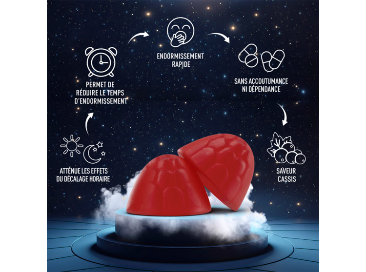 Edulcorants: sirop de maltitol- sorbitol, pectines de citron (épaissisant: pectines, émulsifiant: polyphosphate de sodium, anti-oxydant: tartrate double de potassium et de sodium, sucrose), concentré de jus de carotte (acidifiant: acide citrique, arôme naturel cassis, mélatonine, agent d'enrobage: cire de carnauba ( anti-oxydant: extrait riche en tocophérol, acidifiant: acide citrique, huile de tournesol). Ne pas dépasser la dose journalière indiquée. À tenir hors de portée des enfants. Ce complément alimentaire ne peut se substituer à une alimentation variée, équilibrée et à un mode de vie sain.