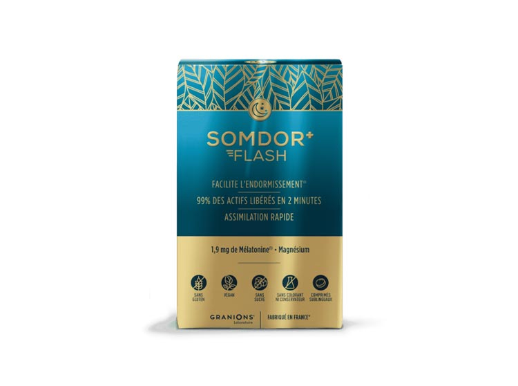 Somdor+ Flash a été spécialement formulé pour toutes les personnes sujettes aux problèmes de sommeil liés à un rythme décalé. Il est destiné à faciliter l'endormissement et à atténuer les effets du décalage horaire grâce à son dosage de 1.9 mg de mélatonine. Sa formule est complétée par du magnésium. Sa forme sublinguale permet une libération de 99.4% des actifs en 2 minutes et un pic de mélatonine en 10 minutes dans le sang.