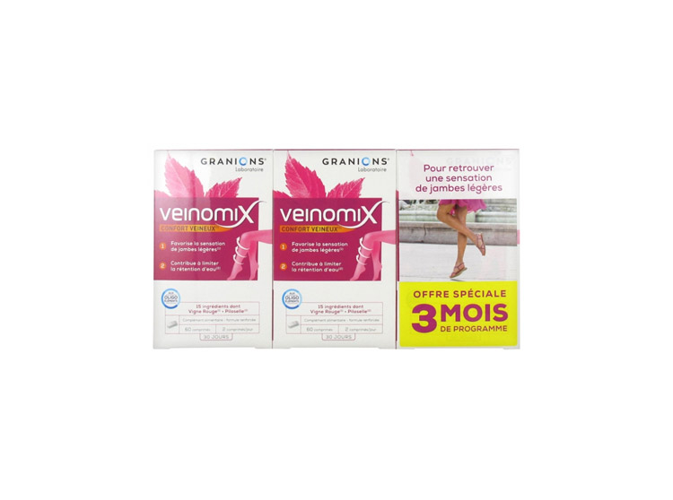 Le Laboratoire des Granions, fort de son expertise pharmaceutique depuis 1948, a mis au point Veinomix, une solution complète qui associe les vertus d’une sélection de plantes, de vitamines et d’oligoéléments de haute qualité, pour apporter légèreté, confort et bien-être quotidien à vos jambes.