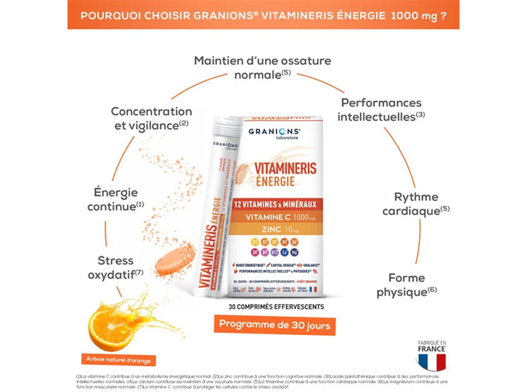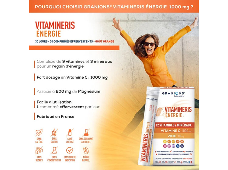 Pour stimuler les fonctions essentielles de votre corps et préserver votre capital santé, le Laboratoire des Granions® a développé VITAMINERIS Énergie 1000mg, un concentré de 9 vitamines et 3 minéraux. Cette association unique permet de soutenir votre forme physique et mentale au quotidien.