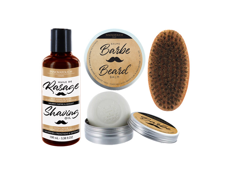 Huile à barbe, savon barbe, baume barbe, brosse barbe