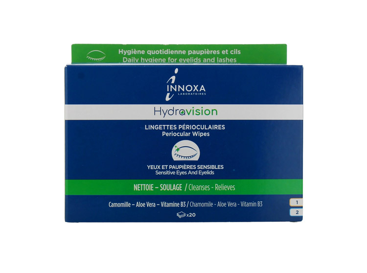 Innoxa a développé sa gamme Hydravision en proposant des lingettes périoculaires. La lingette Hydravision sera votre alliée pour l'hygiène quotidienne de vos paupières et vos cils, en particulier si vous avez les yeux sensbles ou délicats.