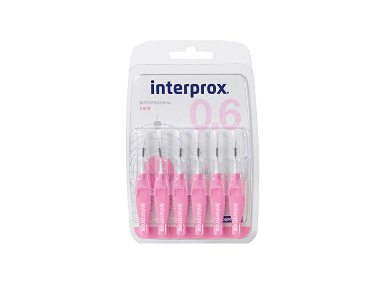Interprox Nano est une brossette interdentaire qui permet de nettoyer les espaces les plus étroits entre vos dents. Utiliser cette brossette au quotidien vous permet de lutter contre les caries et les maladies parodontales en éliminant la plaque dentaire. Avec sa tête et son manche flexible sans effet de mémoire cette brossette est très pratique pour atteindre toutes les zones de la bouche, la Brossette Interprox Nano Rose 6 unités est équipée d'une brosse de 1,9 mm, pour des espaces de 0,6 mm et possède un capuchon protecteur pour la brosse qui assure une hygiène optimale.