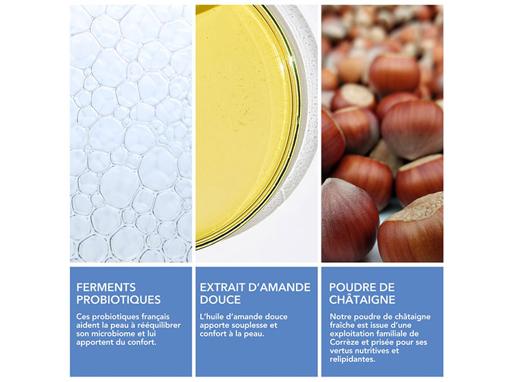 Les peaux réactives peuvent souffrir de tiraillements, échauffements, rougeurs, plaques de sécheresse... Ces réactions sont liées à une flore microbienne déséquilibrée. C'est pour renforcer cette flore que la Crème nettoyante solide est enrichie de prébiotiques (oligosaccharides) et probiotiques (lactobacilles). En retrouvant son équilibre, la peau gagne en confort, retient mieux l'hydratation et s'assouplit.