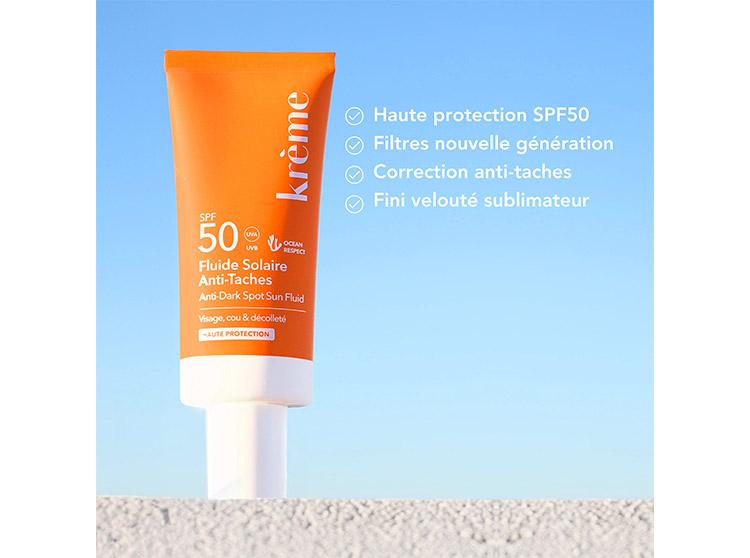 Ce Fluide Solaire SPF 50 anti-taches allie 4 filtres nouvelle génération pour offrir une haute protection UVB & UVA tout en respectant la peau et les océans. Comme un voile seconde peau léger, sa formule, enrichie d'un actif breveté anti-taches, régule l’hyperpigmentation et lisse les ridules de déshydratation pour préserver la jeunesse de la peau. Protégée, unifiée, hydratée, la peau rayonne d’un hâle durable et lumineux.