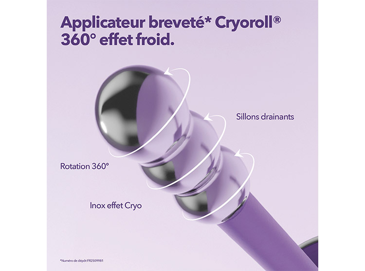 Prélever le sérum avec l’applicateur CryoRoll® : la juste dose se dépose directement sur les trois billes. Une dose = un œil. Commencer à l’angle interne de l’œil, puis lisser vers l’extérieur. Répéter le mouvement de l’intérieur vers l’extérieur. Utiliser l’extrémité de l’applicateur pour exercer des pressions ciblées sur les zones de tension ou de poches. Répéter les mêmes gestes sur la paupière.