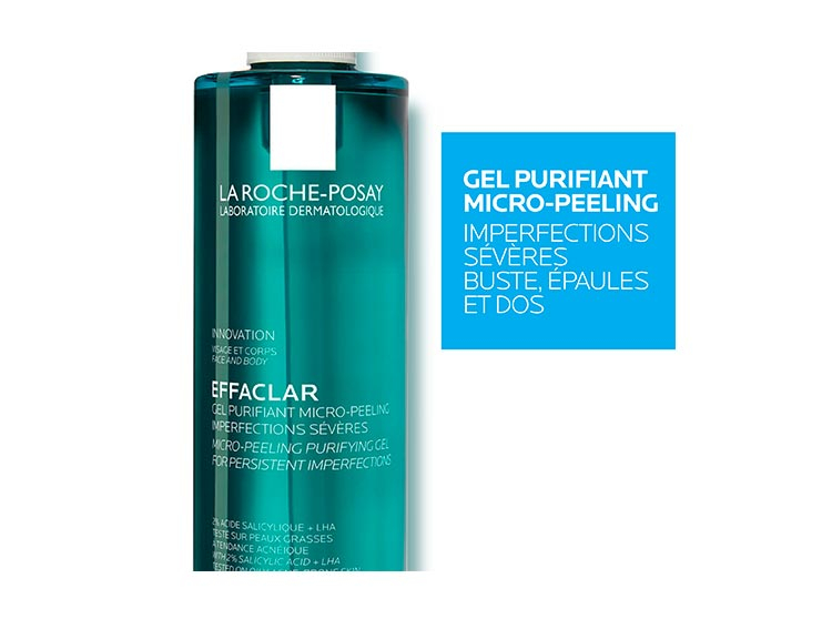 Le Gel Micro-Peeling purifiant de la Gamme Effaclar est un nettoyant corps quotidien anti-imperfections concentré en acide salicylique.