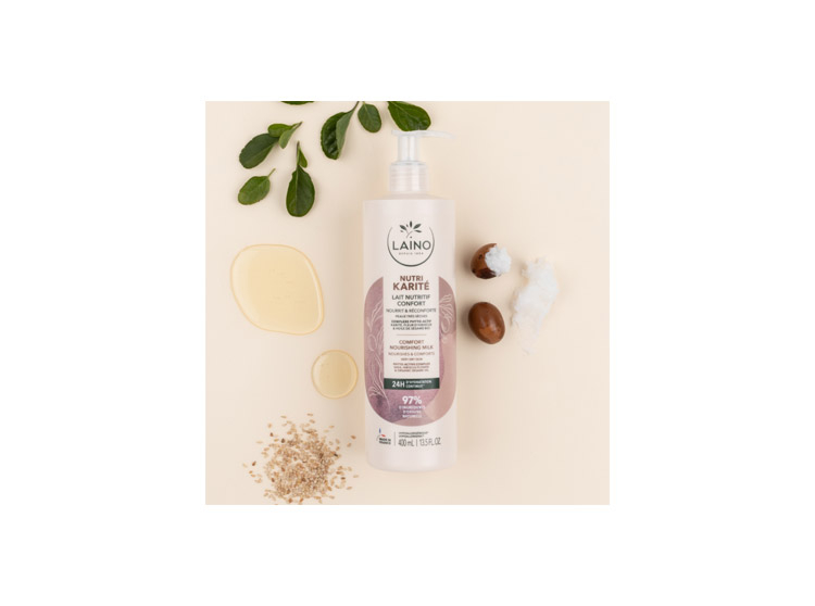 Ce lait corps nutritif confort Laino vous offre une texture agréable hypoallergénique* qui hydrate** durablement la peau pendant 24h et la protège des agressions extérieures.