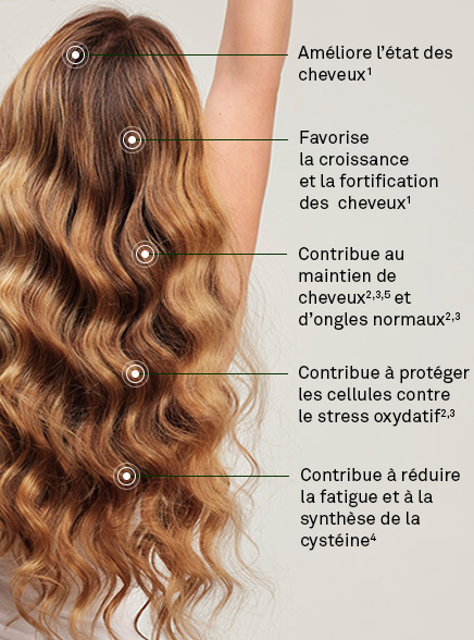 La Vitamine B8 : Contribue au maintien de cheveux normaux. |
