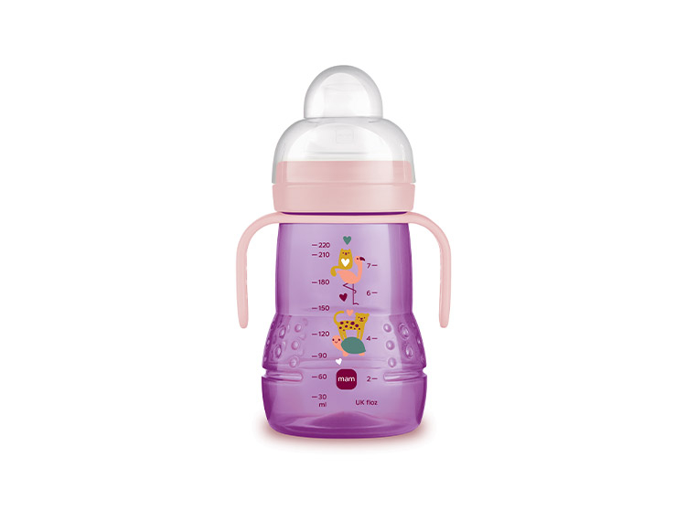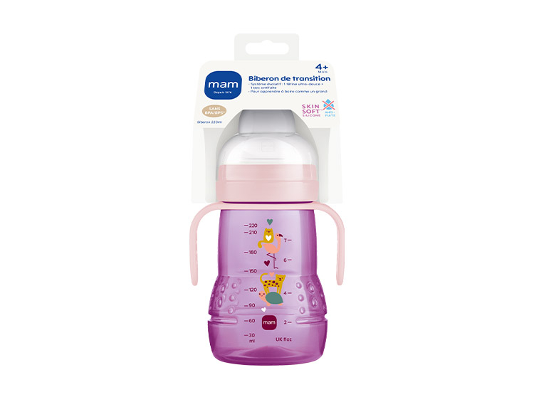 Antifuite et facile à tenir, le MAM Trainer+ représente le biberon idéal pour boire seul. Tétine MAM avec bec extra doux et surface SkinSoft en silicone : pour une transition aisée du sein ou du biberon à la tasse. Des poignées conçues spécialement pour les petites mains des bébés. Grande ouverture pour faciliter le remplissage et le nettoyage.