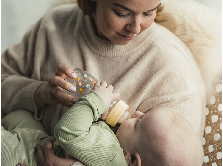 Design plat et symétrique unique : semblable à la forme du mamelon pendant l’allaitement. Surface soyeuse en silicone pour une sensation familière. Notre tétine de biberon est acceptée par 94 % des bébés1