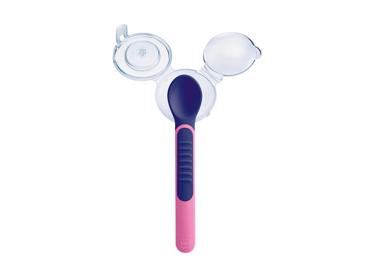 Les couverts d'apprentissage pour bébé Mam sont dotés d'extrémités sensibles à la chaleur qui changent de couleur lorsque la nourriture est trop chaude.
