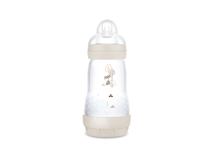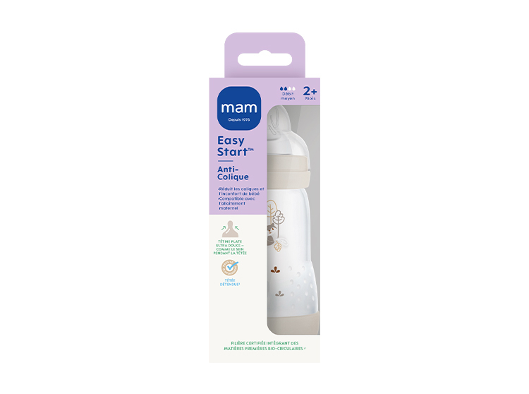 Le Biberon Anti-Coliques Débit 2 Sable de MAM a une contenance de 260ml.