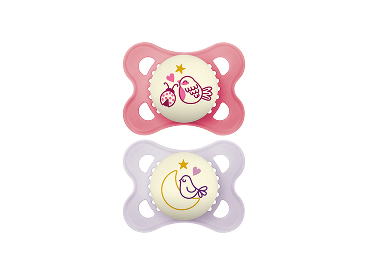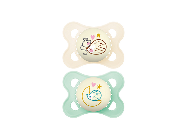 Chaque sucette est dotée d'un bouton phosphorescent décoré qui brille dans la nuit pendant plusieurs heures, facilitant ainsi son repérage et réduisant les perturbations nocturnes. La téterelle en silicone breveté est ultra-souple et soyeuse, offrant une sensation agréable et douce, semblable à celle de la peau.