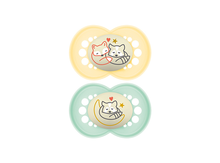 Le bouton phosphorescent décoré brille dans l'obscurité pendant plusieurs heures, facilitant le repérage de la sucette la nuit, ce qui est particulièrement utile pour les nuits paisibles. Le lot est livré avec une boîte de transport et de stérilisation pour garantir une hygiène optimale.