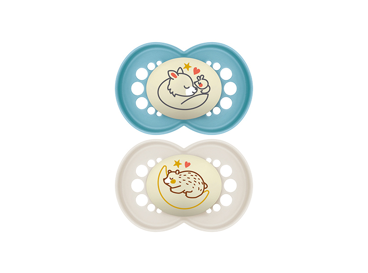 Les sucettes sont équipées d'un bouton phosphorescent décoré qui brille dans la nuit pendant plusieurs heures, facilitant leur localisation dans l'obscurité et permettant une utilisation pratique pendant la nuit. La téterelle, en silicone breveté, est extra-souple et soyeuse, offrant une sensation douce et agréable, semblable à celle de la peau.