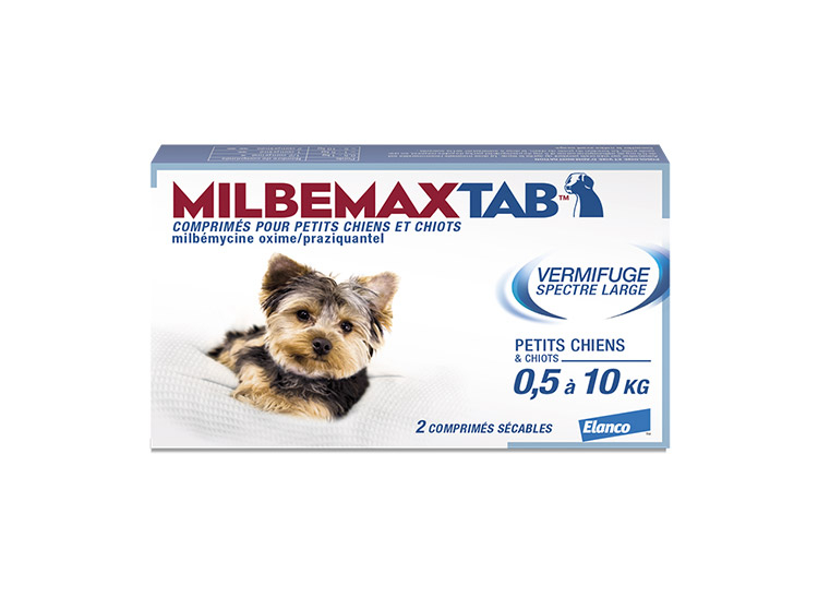 Milbemax Tab Petits chiens et chiots de 0,5 à 10kg permet de lutter contre l’infestation des vers plats et ronds pour les petits chiens et chiots de 0,5 à 10kg , même pour les femelles en période de lactation et de gestation.